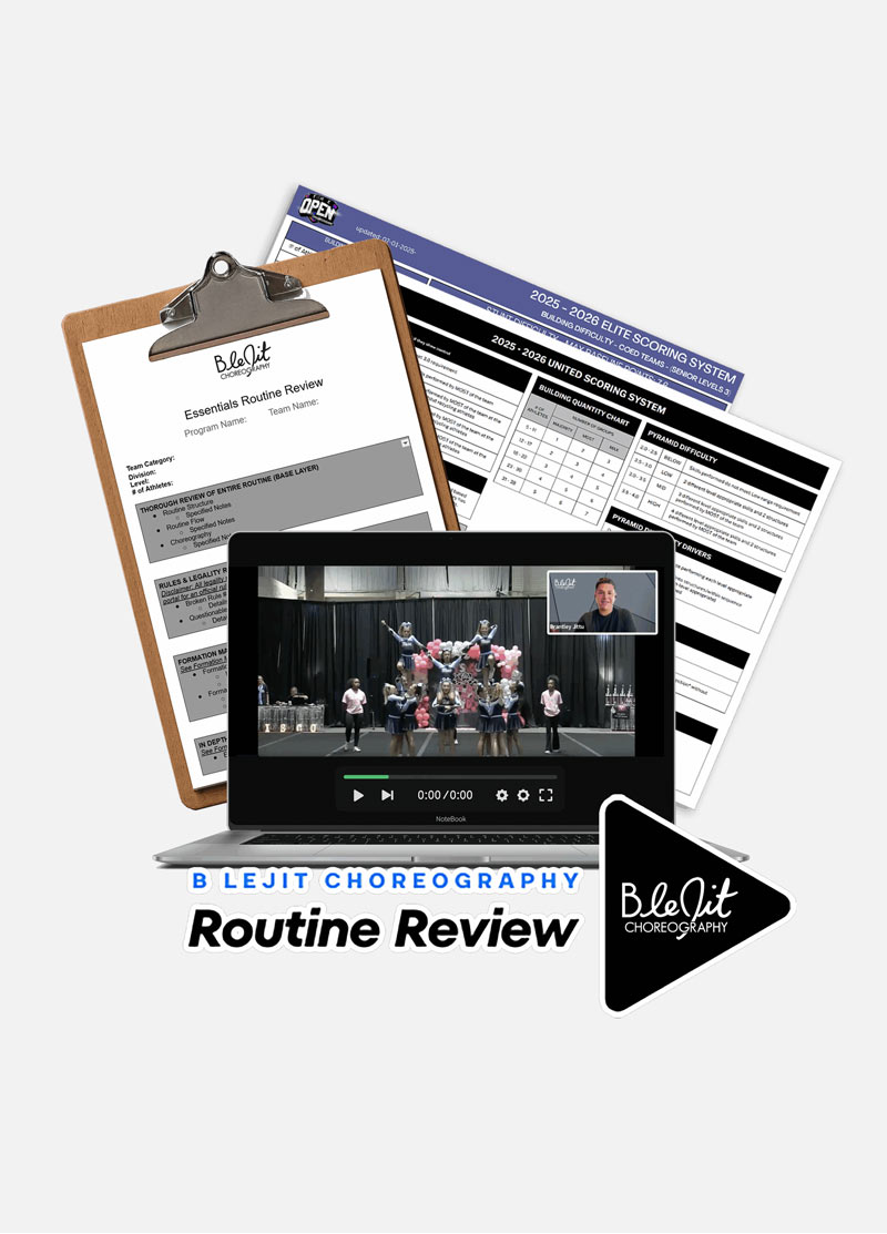 Upload your team’s routine video and get detailed, professional feedback that shows you exactly where to tighten, clean, and earn those missing tenths. Our expert review includes a mock score, legality check, and annotated video breakdown—so your team walks into competition confident, prepared, and ready to hit.